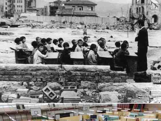 التربويون الجدد لا شيء يوقف التعليم في اليابان صورتين واحدة بعد هيروشيما والثانية بعد تسونامي