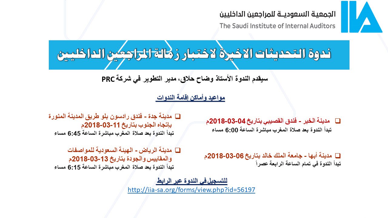 الجمعية السعودية للمراجعين الداخليين Iia Sa Pa Twitter يسرنا دعوتكم لحضور ندوة التحديثات الاخيرة لاختبار زمالة المراجعين الداخليين والتي سيقدمها الأستاذ وضاح حلاق مدير التطوير في شركة Prc وللحضور يلزم تسجيل
