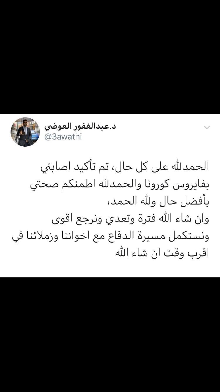 ابوسعد على تويتر الحمد لله علي كل حال تمت اصابتي بفايروس كورونا كوفيد19 جطلتني الكورونا يالعشير